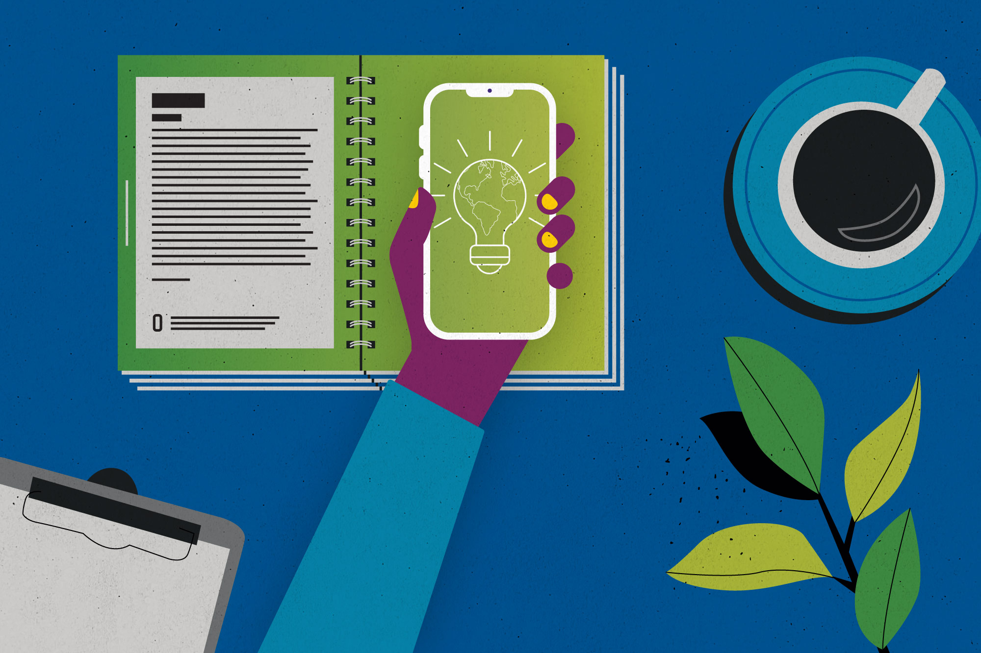 Illustration of a hand holding a phone to view augmented reality over a book.