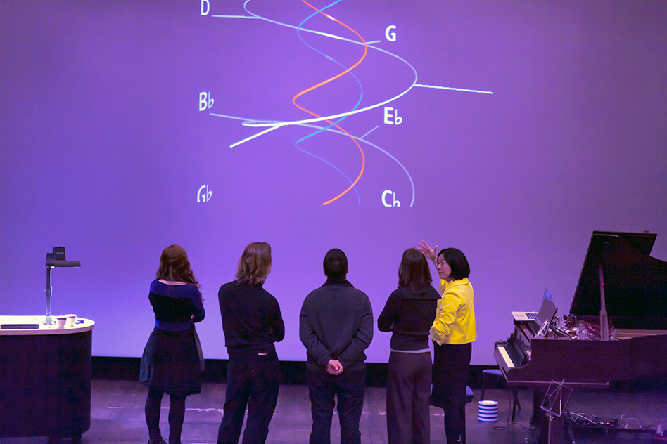 Photo: Elaine Chew describing her spiral array model to other composers. Courtesy of Elaine Chew.